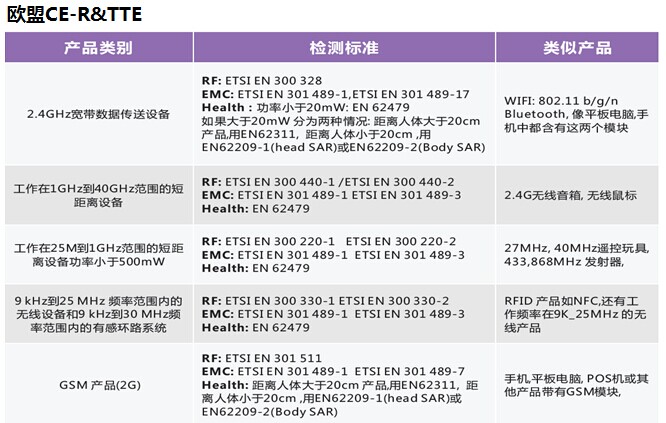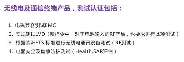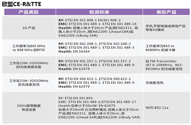 2014年5月22日,無(wú)線電設(shè)備指令(TheRadio Equipment Directive,RED)2014/53/EU正式在歐盟官方公報(bào)(OG)上公布,并于2014年6月12日生效。該指令將取代無(wú)線電與電信終端設(shè)備指令(R&TTE指令),2016年6月12日之前,成員國(guó)應(yīng)將該指令轉(zhuǎn)化為成員國(guó)法律,原R&TTE指令(1999/5/EC)也隨之作廢。2016年6月13日起,成員國(guó)應(yīng)采用新無(wú)線電設(shè)備指令(RED);2017年6月13日起,符合舊R&TTE指令的產(chǎn)品將不允許在歐盟市場(chǎng)上銷售。 On May 22, 2014, RED2014/53/EU Officially published in theEuropean Union's official gazette , and take effect on June 12, 2014. Thedirective will replace R&TTE directive, Before June 12, 2016, member statesshould convert the directive to member states law and the original R&TTEdirective (1999/5 / EC) is invalid. June 13, 2016, member states should adoptthe new RED; from June 13, 2017 products that meet the old R&TTE directivewill not be allowed in the eu market.