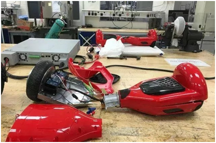 其中一項測試模擬電池過熱后的情形,另外一項模擬當平衡車翻越特別崎嶇不平的路面導致電池被刺穿的情形。兩項測試均以電池發(fā)生威力強大的爆炸并且持續(xù)燃燒很長一段時間而告終。大部分平衡車采用了24節(jié)電池的設計,這也意味著當某款平衡車整體發(fā)生爆炸,其產生爆炸的強度是混凝土房間內模擬測試時所發(fā)生的24倍。