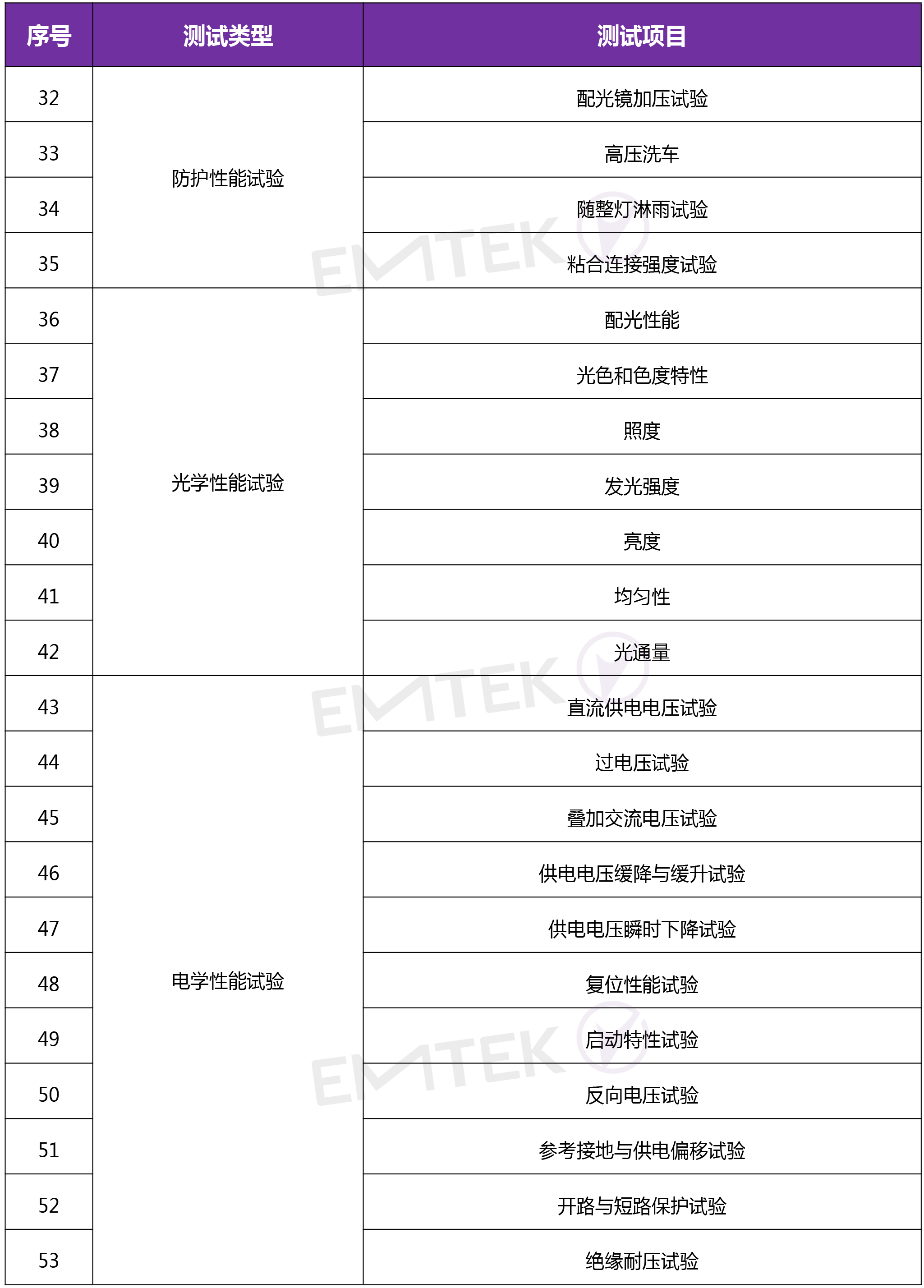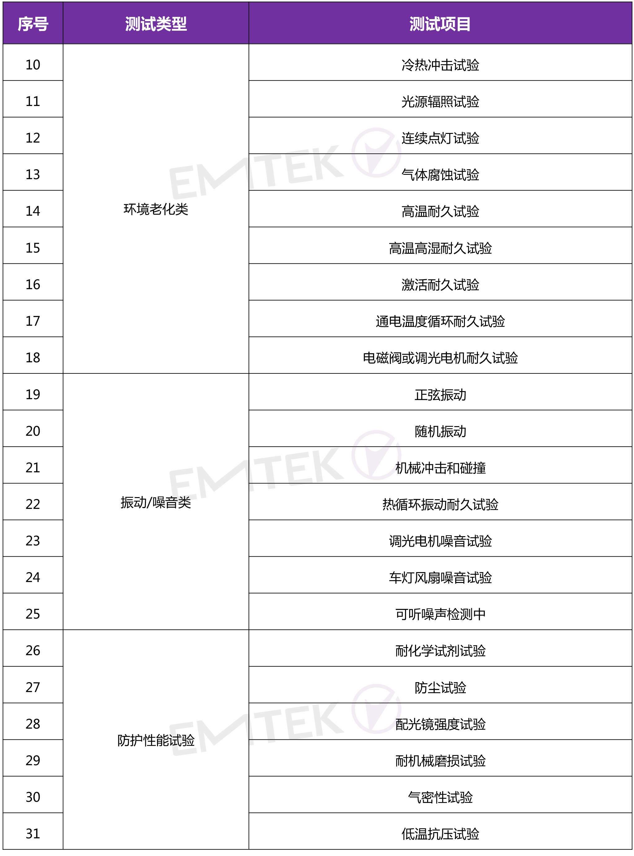 考核車燈的配光性能、光色和色度特性、照度、發(fā)光強(qiáng)度、亮度、均勻性等光學(xué)試驗(yàn),以及電學(xué)性能、EMC等;
