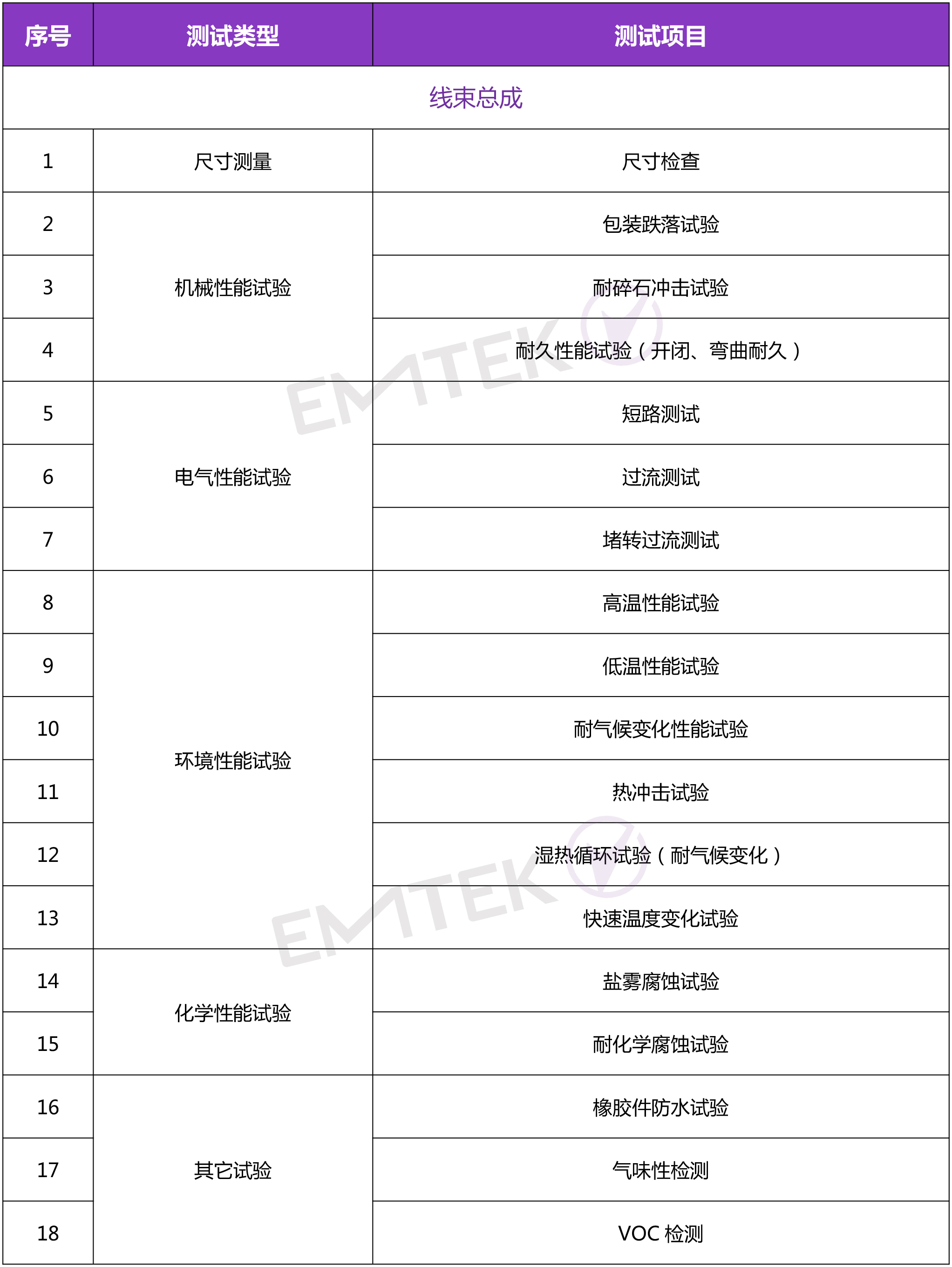 汽車線束環(huán)境空間多樣,經(jīng)歷復(fù)雜的濕熱變化和振動(dòng)變化。為確保線束功能可靠性,其材料選型和檢驗(yàn)、產(chǎn)品設(shè)計(jì)和驗(yàn)證、加工工藝設(shè)計(jì)和驗(yàn)證有嚴(yán)苛的標(biāo)準(zhǔn)規(guī)范和驗(yàn)證流程。典型的測(cè)試服務(wù)有ELV檢測(cè)、VOCs檢測(cè),以及機(jī)械性能、電氣性能、環(huán)境氣候性能等可靠性檢測(cè)。