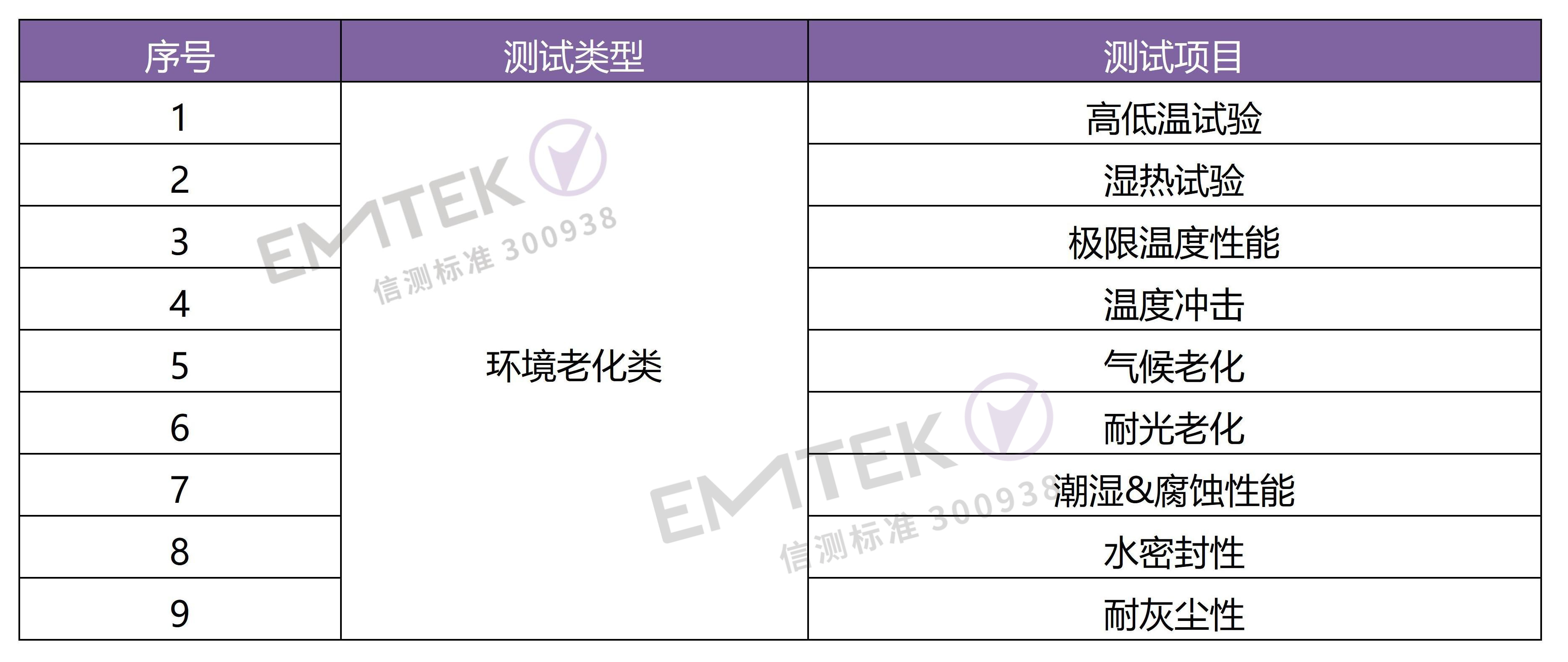 是將產(chǎn)品暴露在自然的或人工的環(huán)境條件下經(jīng)受其作用,以評(píng)價(jià)產(chǎn)品在實(shí)際使用、運(yùn)輸和貯存的環(huán)境條件下的性能,并分析研究環(huán)境因素的影響程度,包含的環(huán)境試驗(yàn)如高低溫試驗(yàn)、氣候老化、耐光老化、潮濕&腐蝕、耐灰塵性等;