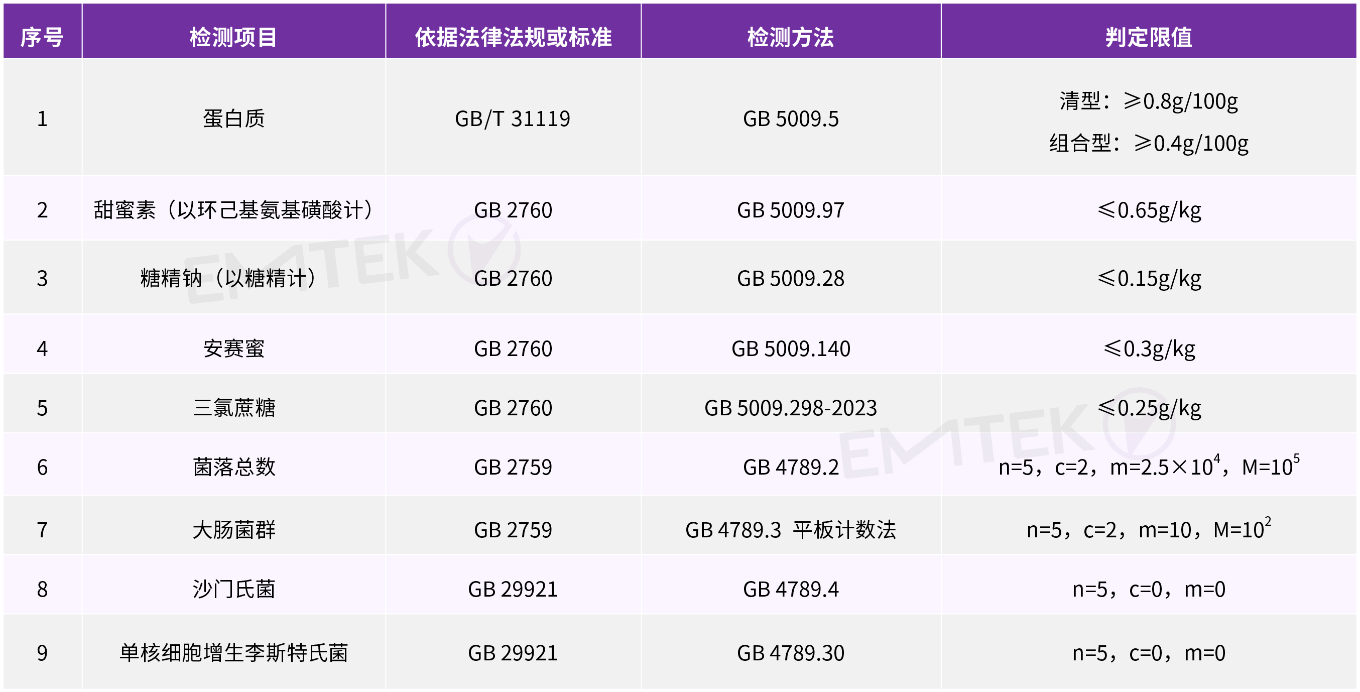 雪糕在《2024年全國食品安全監(jiān)督抽檢實施細則》中被劃分到冷凍飲品一類。參照的產(chǎn)品標準有GB/T 31119-2014《冷凍飲品 雪糕》和GB 2759-2015 《食品安全國家標準 冷凍飲品和制作料》,檢測項目和檢測限值見下表。