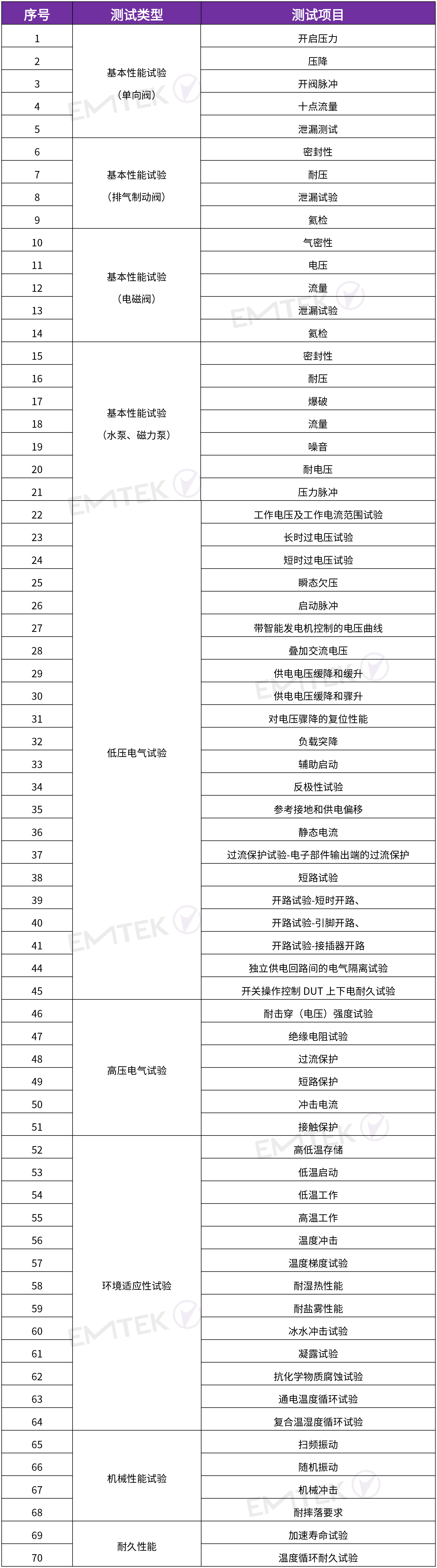 檢測(cè)并評(píng)價(jià)產(chǎn)品低壓電氣部分在經(jīng)受不同電氣負(fù)荷條件下的產(chǎn)品功能和性能表現(xiàn),包括工作電壓及工作電流范圍試驗(yàn)、長時(shí)過電壓試驗(yàn)、短時(shí)過電壓試驗(yàn)、瞬態(tài)欠壓、啟動(dòng)脈沖、帶智能發(fā)電機(jī)控制的電壓曲線、疊加交流電壓、供電電壓緩降和緩升、供電電壓緩降和驟升、對(duì)電壓驟降的復(fù)位性能、負(fù)載突降、輔助啟動(dòng)、反極性試驗(yàn)、參考接地和供電偏移、靜態(tài)電流、過流保護(hù)、短路試驗(yàn)、開路試驗(yàn)-短時(shí)開路、開路試驗(yàn)-引腳開路、開路試驗(yàn)-接插器開路等。