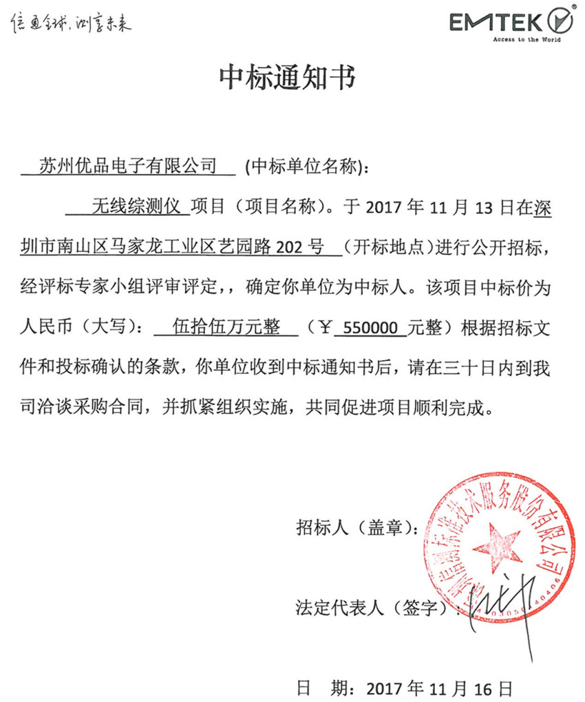 蘇州優(yōu)品中標通知書