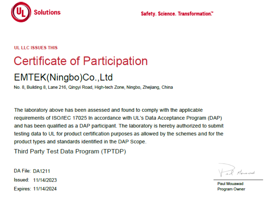 信測(cè)標(biāo)準(zhǔn)(寧波)公司長(zhǎng)期以來(lái)同UL保持密切友好合作,是UL公司多標(biāo)準(zhǔn)TPTDP免目擊實(shí)驗(yàn)室和WTDP目擊實(shí)驗(yàn)室,為客戶縮短認(rèn)證周期、節(jié)約差旅費(fèi)/成本,更好體驗(yàn)信測(cè)標(biāo)準(zhǔn)一站式、通全球的優(yōu)質(zhì)服務(wù)。