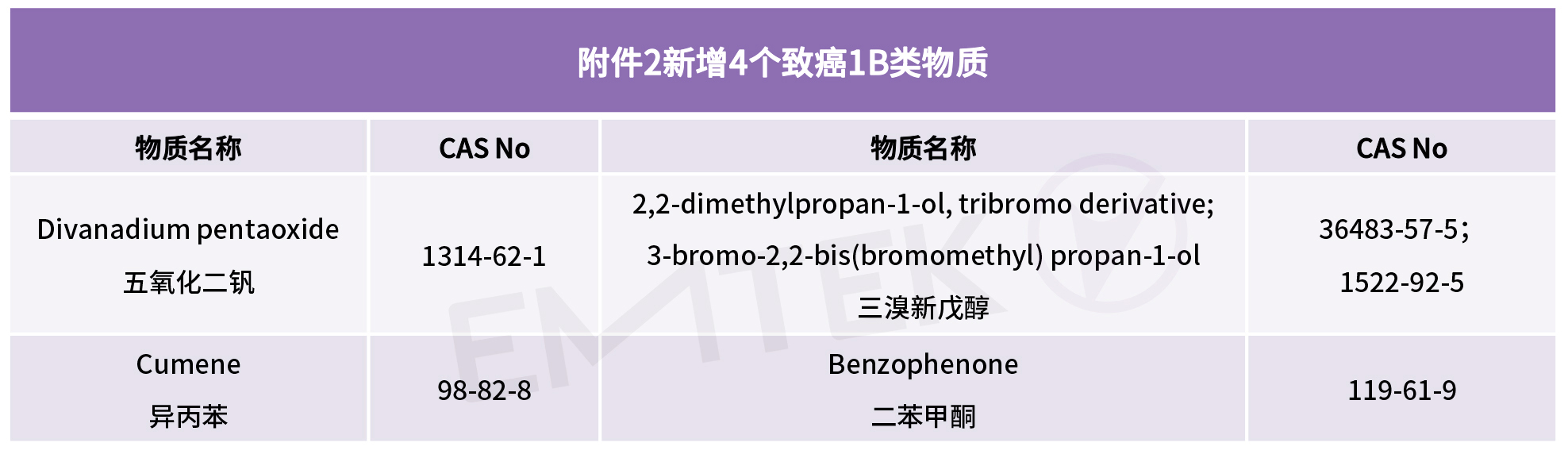 此次修訂,新增24項(xiàng)CMR物質(zhì),新增物質(zhì)將于2023年12月1號(hào)生效,同時(shí),針對(duì)之前的5項(xiàng)CMR物質(zhì)信息進(jìn)行了更新,具體新增物質(zhì)如下: