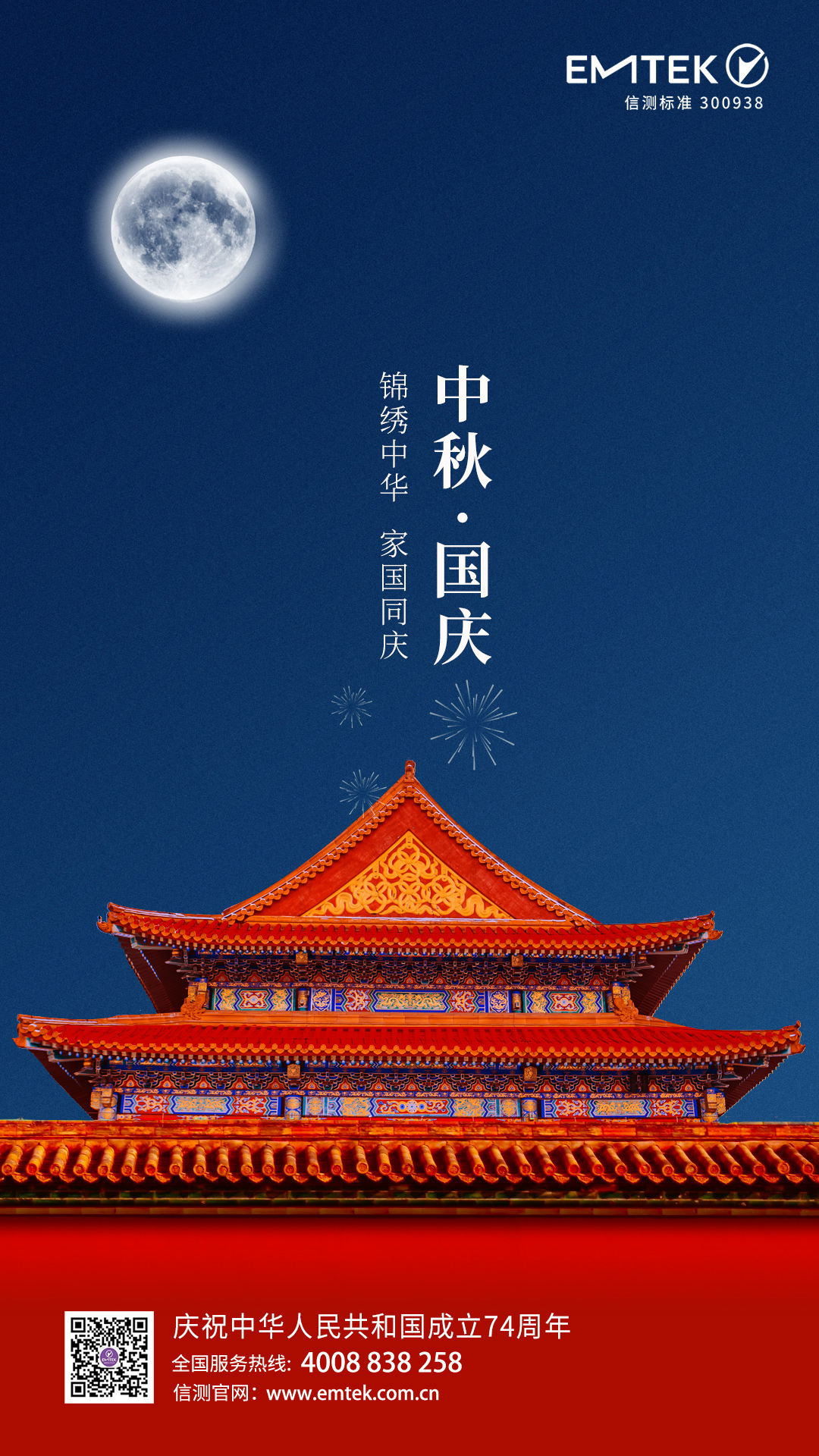 時(shí)值中秋國慶相逢喜慶之際,EMTEK信測(cè)標(biāo)準(zhǔn)衷心祝福偉大祖國繁榮昌盛,國泰民安!祝愿大家闔家團(tuán)圓,幸福安康,節(jié)日快樂!
