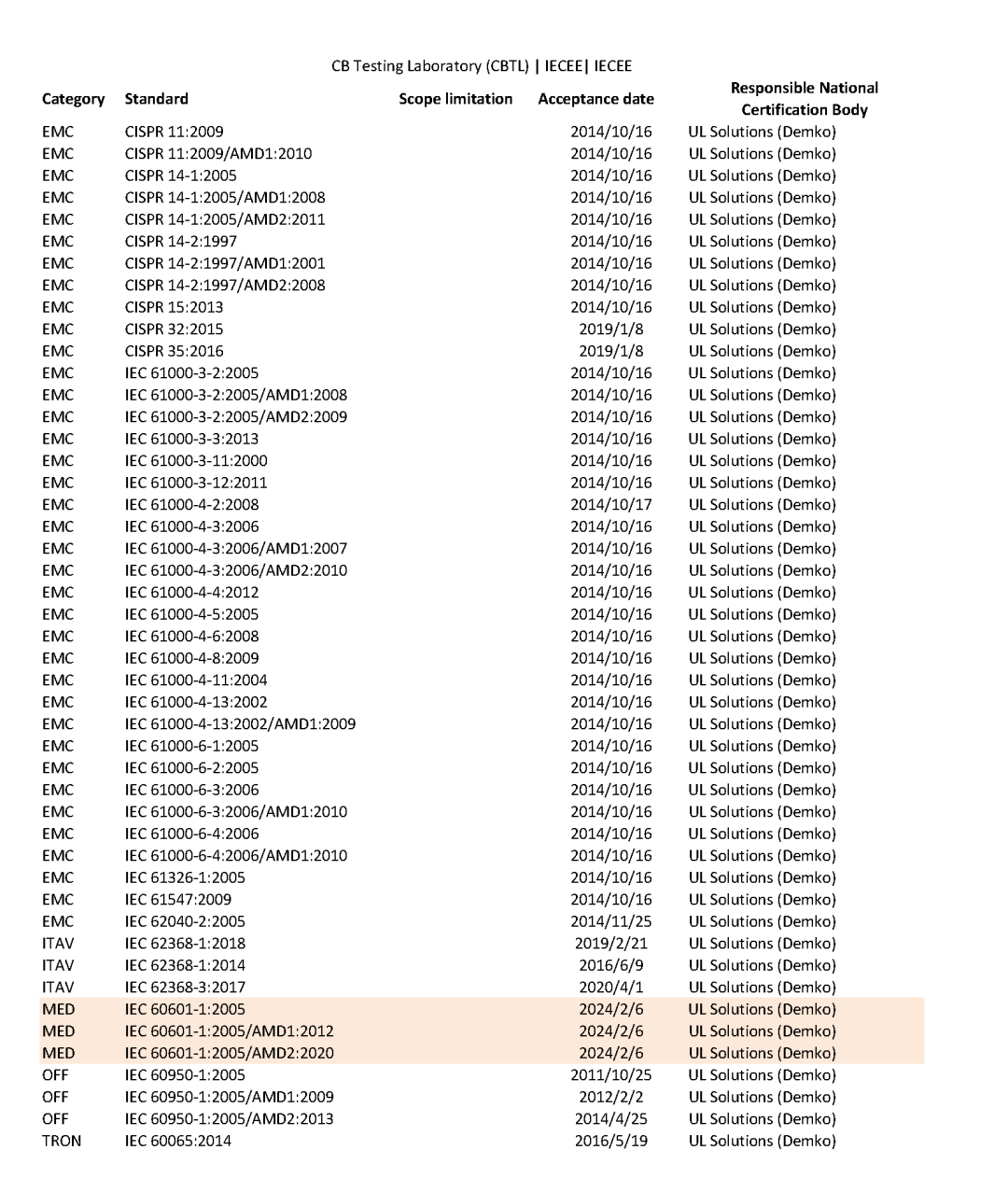 信測標(biāo)準(zhǔn)在CNAS認(rèn)可的基礎(chǔ)上于2022年9月20日取得ANSI AAMI ES 60601-1 / CAN CSA 60601-1的UL TPTDP認(rèn)可資質(zhì),2024年2月6日取得IEC 60601-1的CBTL認(rèn)可資質(zhì),可為廣大醫(yī)療電源廠商提供一站式檢測認(rèn)證服務(wù),助力認(rèn)證合格的醫(yī)療電源行銷全球。