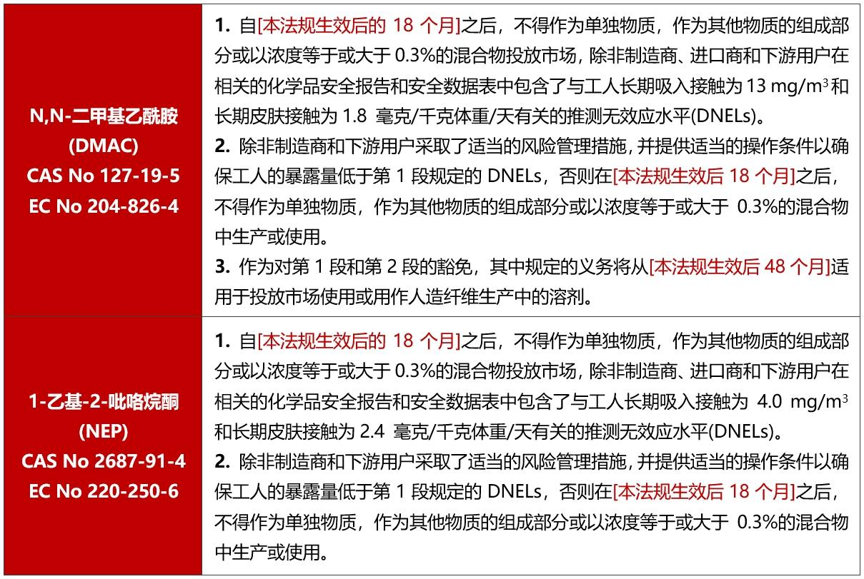 法規(guī)((EC) No 1907/2006)附錄 XVII,增加 N,N-二甲基乙酰胺(DMAC)和 1-乙基-2-吡咯烷酮(NEP)的限制條款。該提案預(yù)計(jì)將于 2025 年第一季度通過(guò)。