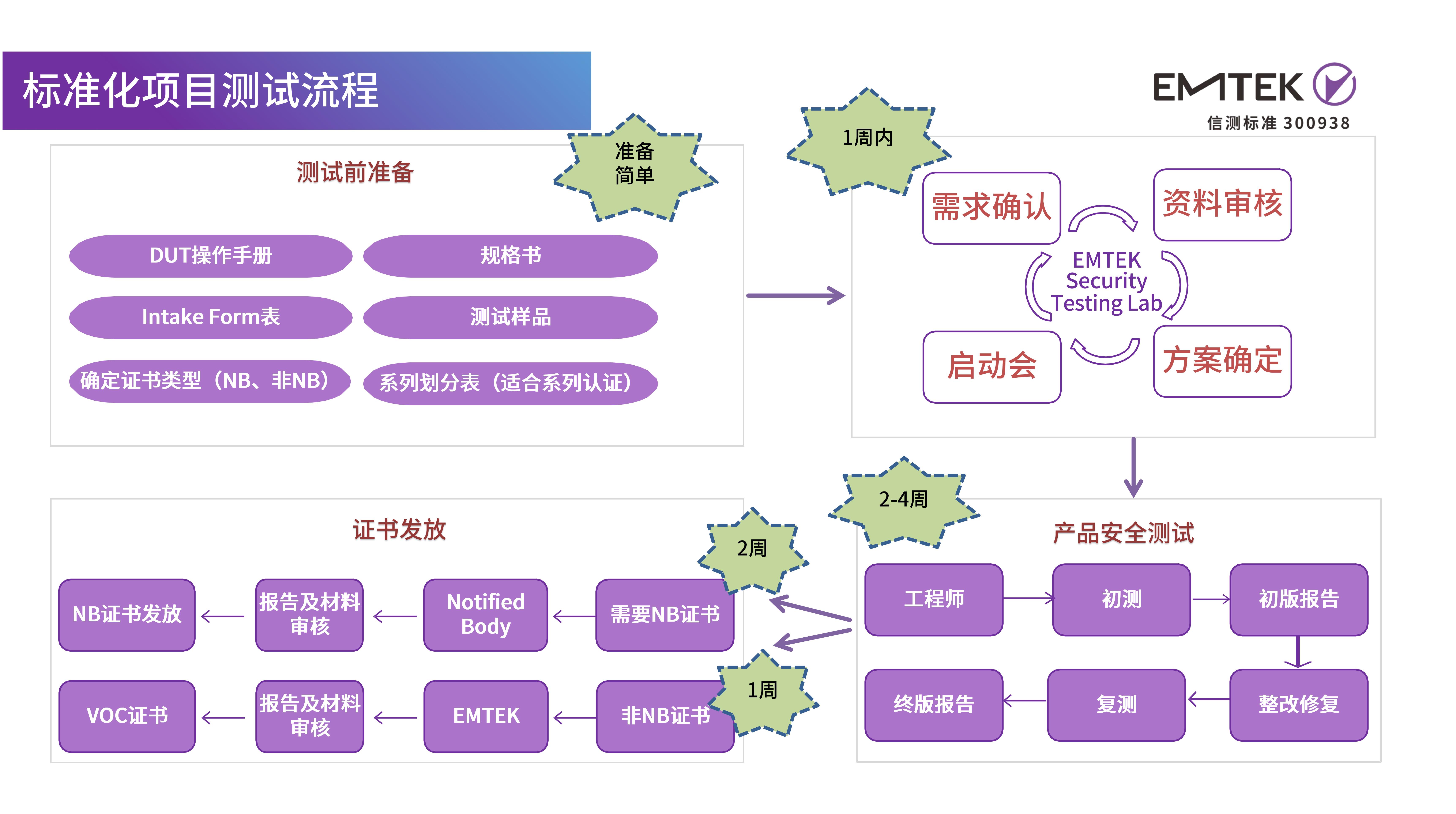 根據(jù)產(chǎn)品的功能復(fù)雜程度不同,評測周期也有所不同,一般情況下,在收到資料和樣機(jī)起算,4-5周內(nèi)可完成評測及發(fā)證。