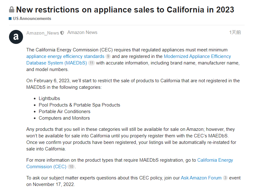 平臺商家在銷售上述商品時,若未在CEC的MAEDbS正確注冊,商品將無法通過亞馬遜在加利福尼亞州銷售。只有亞馬遜確認商品已完成注冊后,商品才會自動恢復(fù),允許在加利福尼亞州銷售。