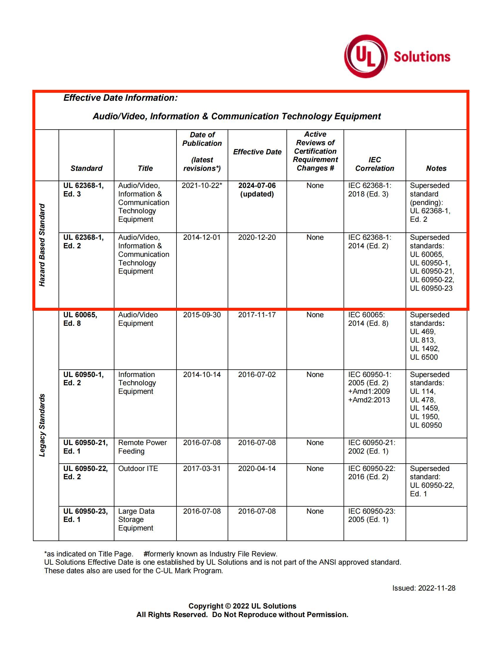 UL在2022年11月28日發(fā)布更新,UL 62368-1, Ed. 3生效日期更新到2024-07-06,這意味UL 62368-1第三版生效日期更新與歐洲一致。