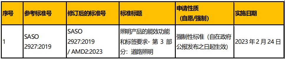 SASO 2927:2019 《照明產(chǎn)品的能效要求、操作要求和標(biāo)簽——第三部分:道路照明》 包括(第10.2 項)LED 要求,刪除 “色溫必須在3000-6000 K 之間” 的表述。