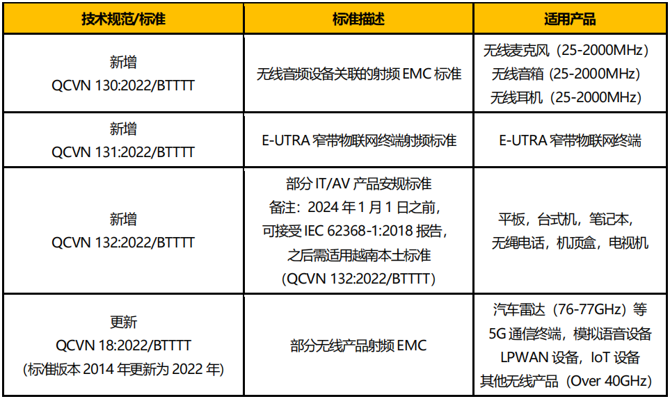 2023年2月8日,越南電信部(MIC)發(fā)布強(qiáng)制認(rèn)證法規(guī)草案,將取代去年5 月發(fā)布的02/2022/TT-BTTTT。新草案當(dāng)前尚在公咨期,預(yù)計第二季度正式發(fā)布。