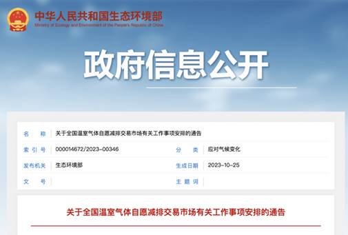 2023 年 10 月 24 日,生態(tài)環(huán)境部發(fā)布關(guān)于全國溫室氣體自愿減排交易市場有關(guān)工作事項(xiàng)安排的通告。