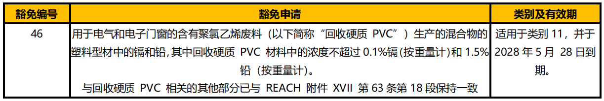 此外,該豁免的范圍與 REACH 附件 XVII 第 63 條中有關(guān) PVC2 中鉛的規(guī)定對(duì)回收 PVC 中鉛的減損一致。因此,EC 已授予 RoHS 指令附件 I 第 11 類(lèi)的豁免。表 A 豁免詳情。