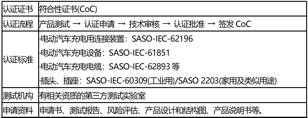 沙特阿拉伯為實現(xiàn)本國“2030 愿景”,減少碳排放,大力鼓勵電動汽車產(chǎn)業(yè)的發(fā)展并支持投資電動汽車基礎(chǔ)設(shè)施建設(shè),逐漸成為電動汽車及充電設(shè)備企業(yè)出口新興潛力市場。2019 年以來,沙特相繼發(fā)布了電動汽車相關(guān)的技術(shù)法規(guī)以及電動汽車充電設(shè)備認證要求,以下為電動汽車充電設(shè)備出口沙特阿拉伯的強制性認證要求。
