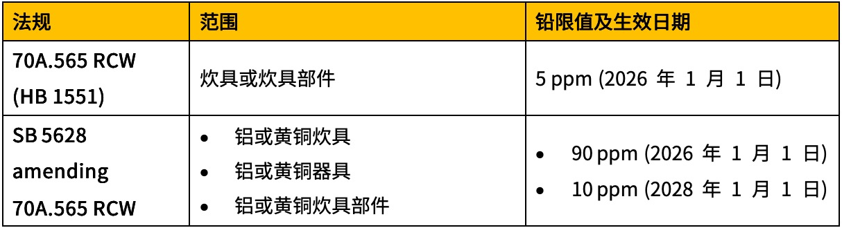 在2024年3月28日,美國(guó)華盛頓州通過(guò)了HB 1551法案(編纂為 70A.565 RCW),限制炊具或炊具組件中的鉛或鉛化合物含量不得超過(guò)5ppm, 且該限制將于2026年1月1日生效。